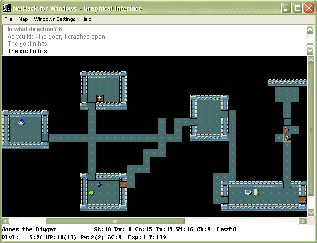 In NetHack, you choose your race, role (class), gender, and alignment (lawful, neutral, or chaotic) and head down into the dungeon to retrieve the Amulet of Yendor. The amulet is said to grant immortality if offered to the gods. Why the hell anyone would want to live forever is beyond me, but maybe I’m just a downer. There are, of course, sub-quests, one of which is specific to whatever class you chose. The dungeon is about 50 floors, and the journey is never the same twice. Needless to say, the dungeon is chock-full of all kinds of monsters (and I mean all kinds; the variety is staggering), most of whom want to murder the shit out of you and eat your body. There are also a lot of leftover bits of gear lying around from the chumps who tried this before you, and some of them (potions, scrolls, etc) give no outward indication as to their purpose or effect. You can always go in blind, but that’s as risky as it sounds. Drinking something when you don’t know what it is? Sounds like the way several of my early D&D characters fucking died. Let’s do it!